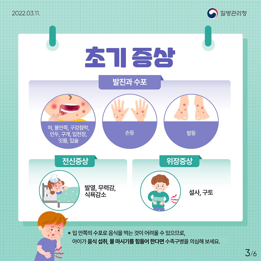 - 식욕부진: 수족구병에 걸린 어린이들은 식욕부진, 설사, 구토 등의 증상을 보일 수 있으며, 심한 경우 탈수 증상이 나타날 수도 있습니다.